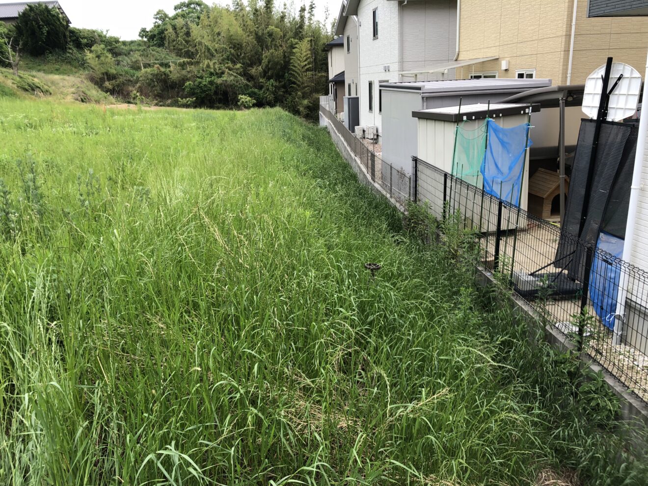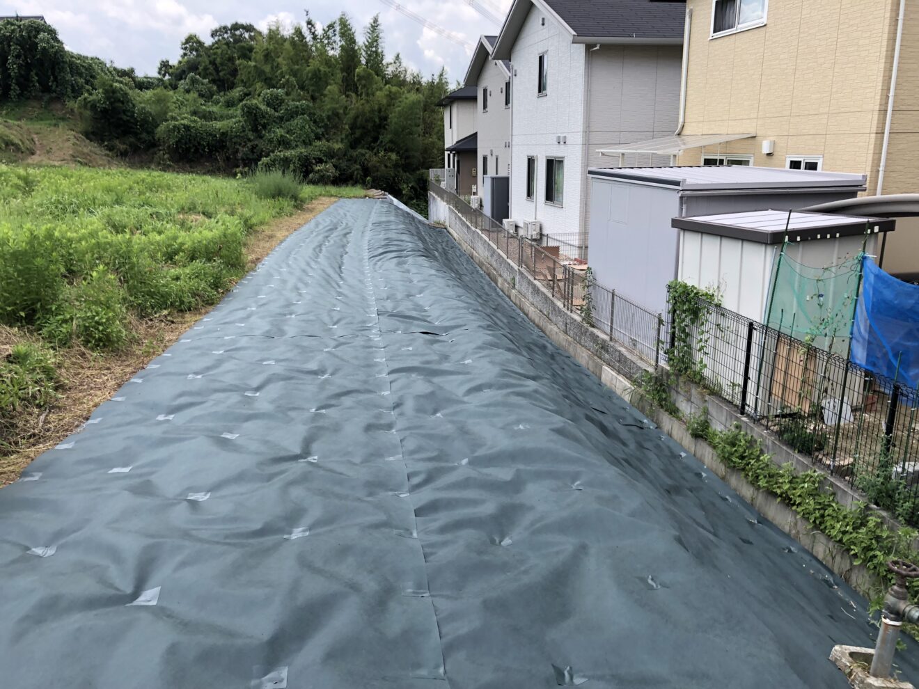 伸びきった雑草を刈り、その上から防草シートをはりました。