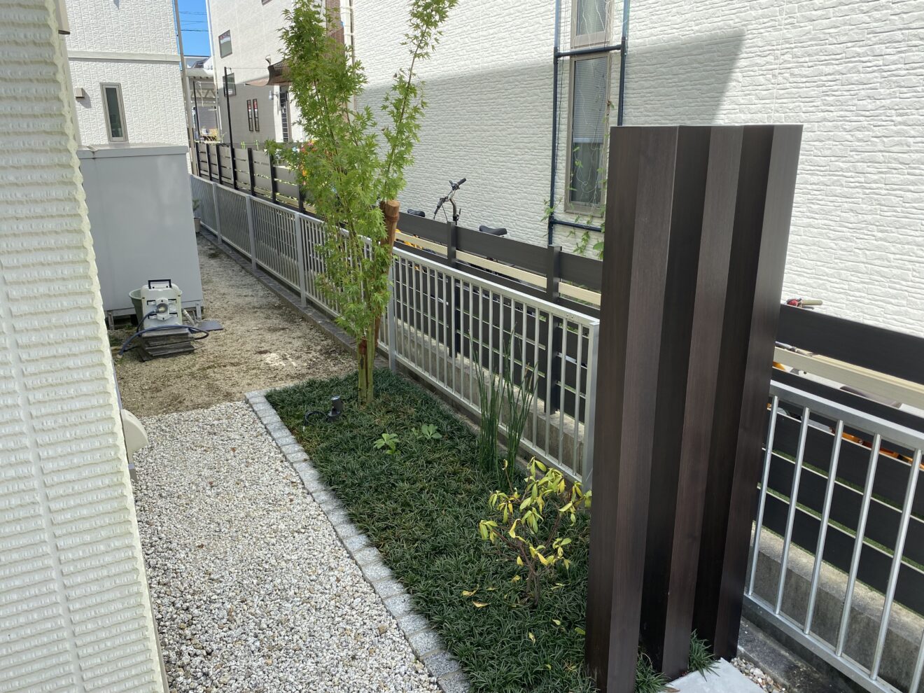 右側にはタマリュウを敷き、そこにイロハモミジを植えました。