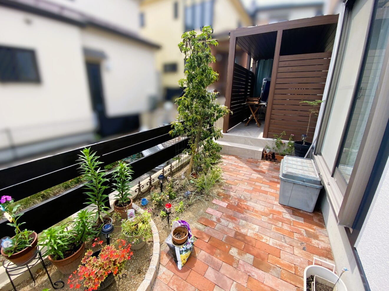 無垢の木で作られていた既存のウッドデッキをタイルデッキにし、屋根をつけることで広々としたくつろぎ空間を実現しました。