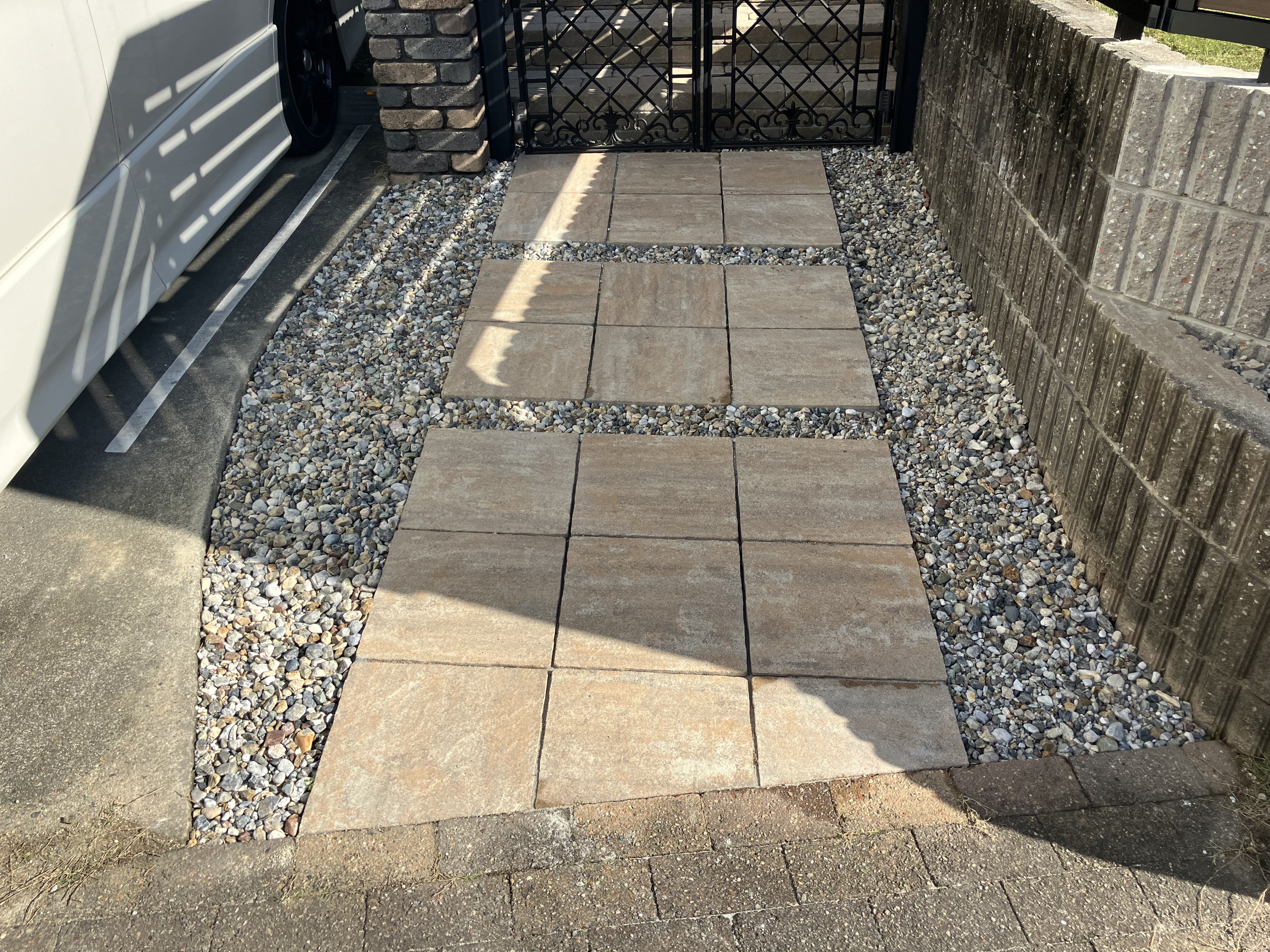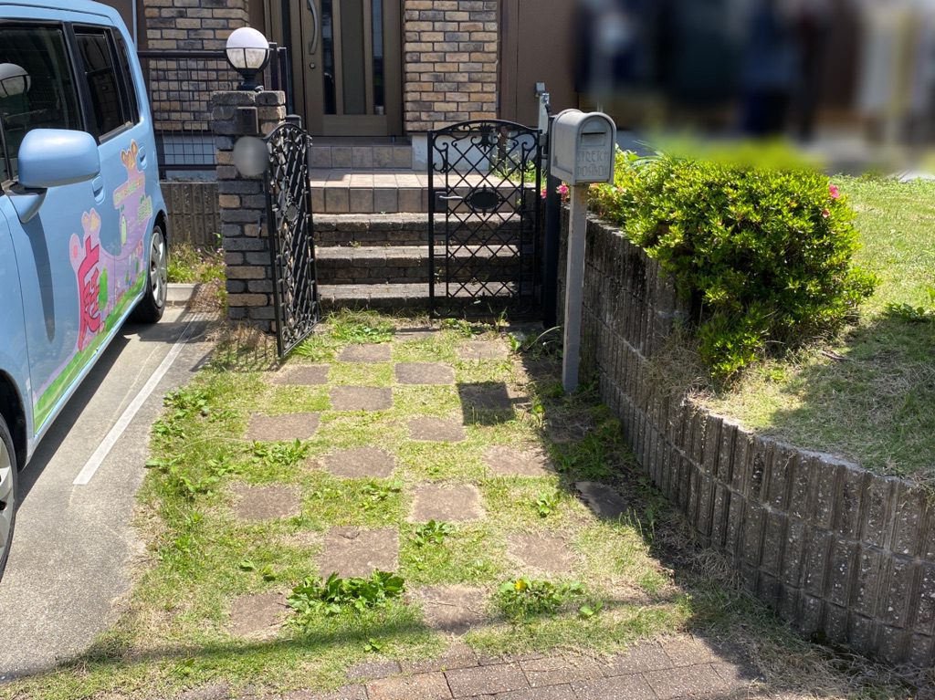 アプローチは舗装材を使用して歩きやすくし、周りは防草シートと砂利敷きですっきりとした印象に。