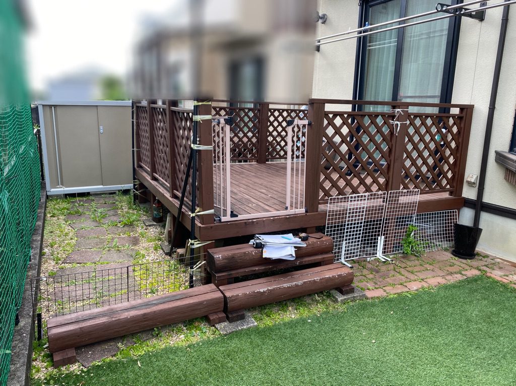デッキに埋め込みフックを設置し日除けシェードも取付けれる仕様にしました。