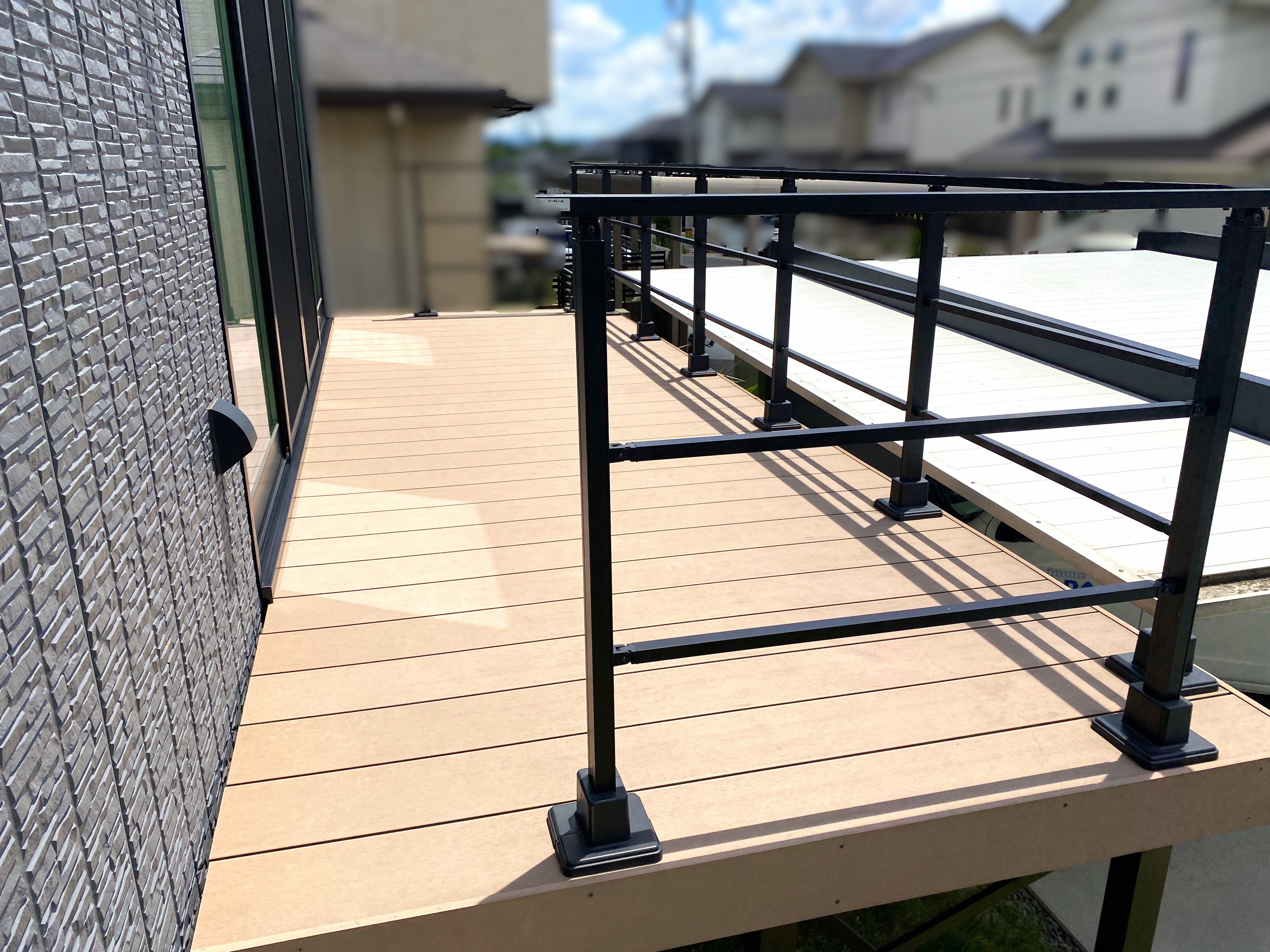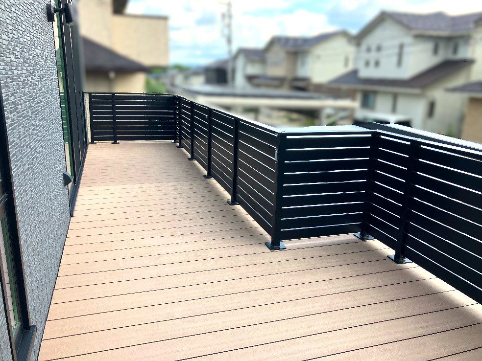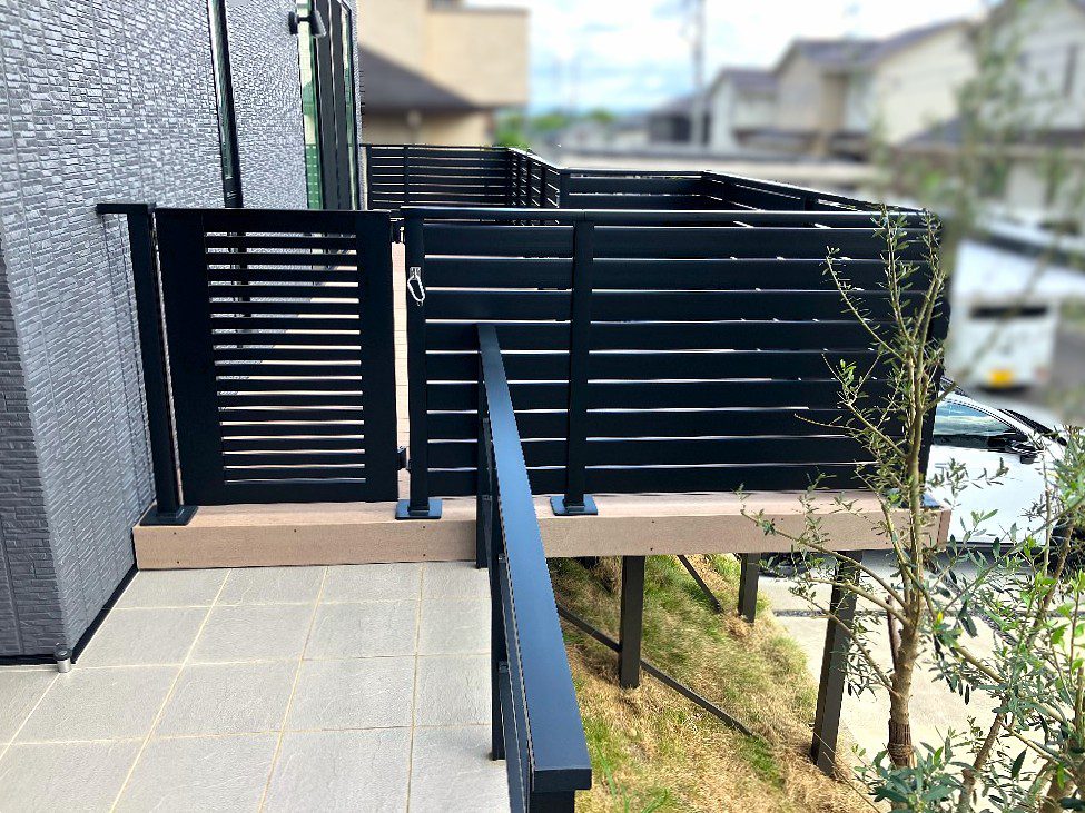 デッキで過ごす際に、外部からの視線も気にならないように、以前の開放的な手すりを撤去し、モダンな黒い横板タイプのプライバシーフェンスを新設。
