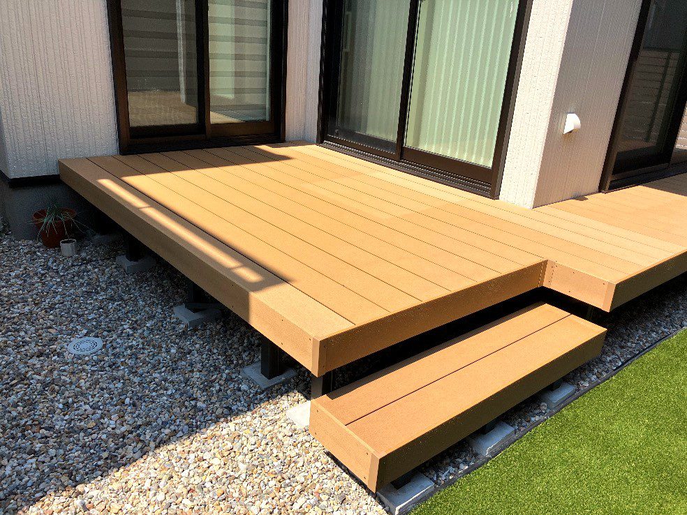 リビングの窓からフラットに出入りできるよう「LIXIL 樹ら楽ステージ(人工木デッキ)」を設置しました。