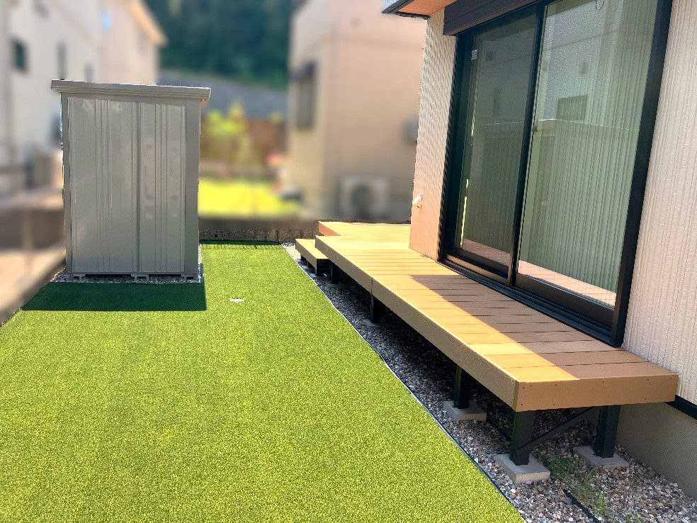 デッキの周囲には「リアリーターフ(人工芝)」を敷設。雑草のお手入れが不要で、一年中緑を楽しめるにお庭にしました。