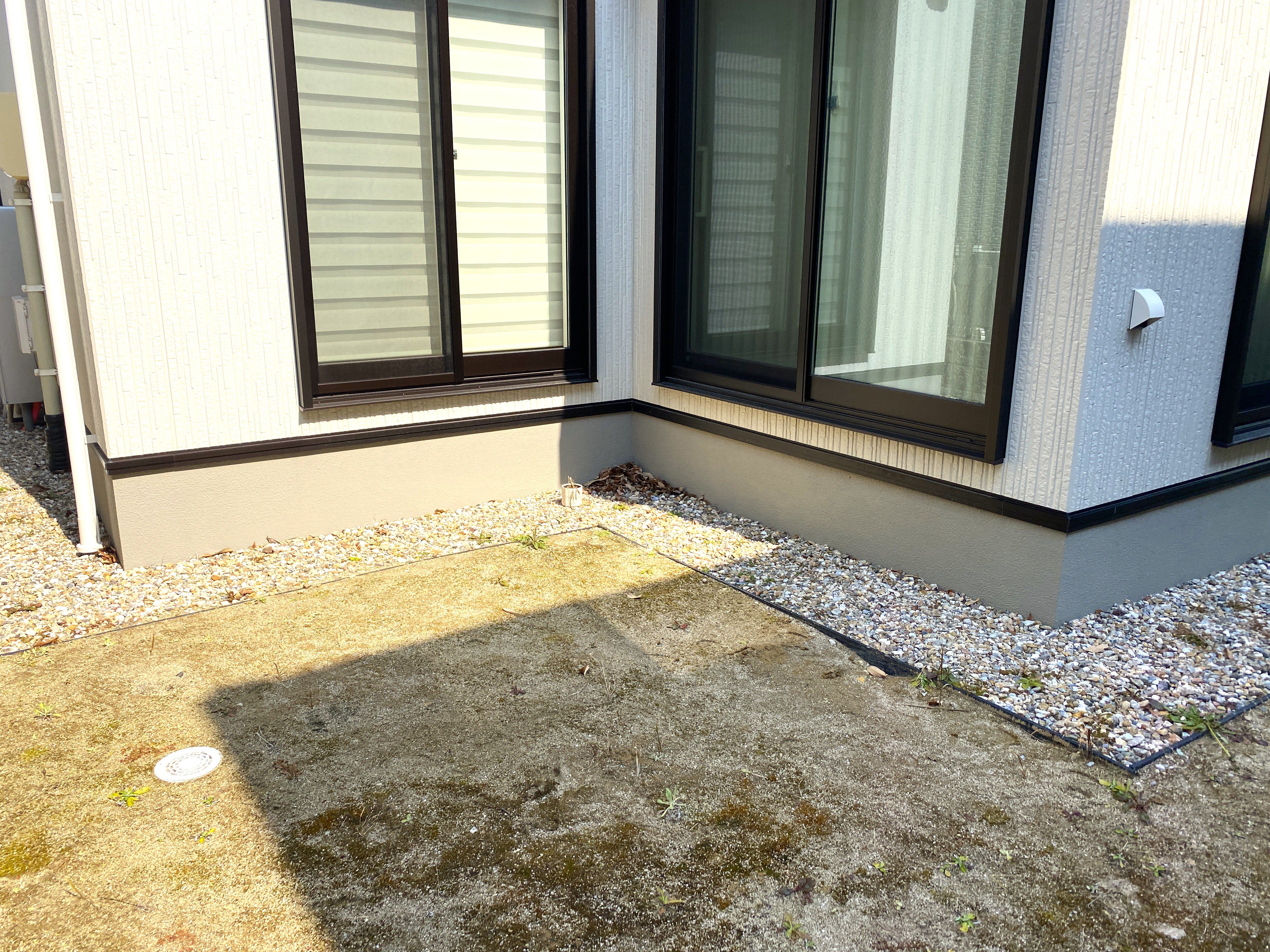 ・駐車場側は樹木・芝を撤去し、防草シートと豆砂利で雑草対策。