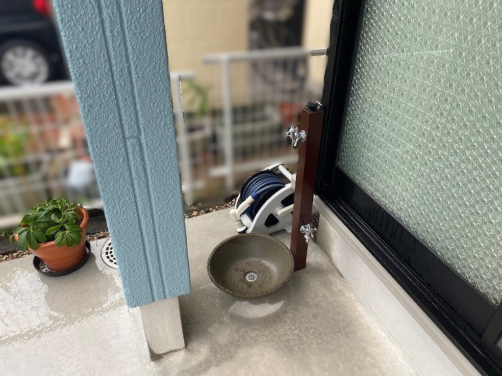 駐車場の後ろにはオフブラックの水栓柱と陶器製のパンを設置し、シックな色合いが外構のアクセントとなる利便性の高い水まわりを整えています。