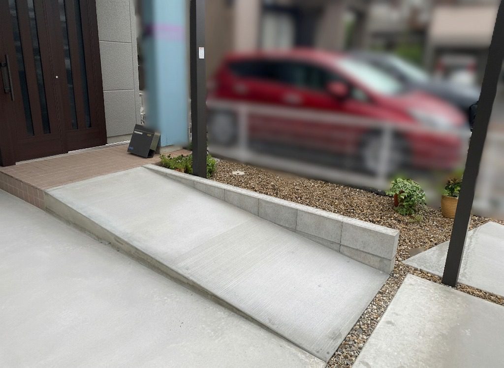 玄関アプローチには新たにゆとりある幅を確保したコンクリートスロープを造成しました。