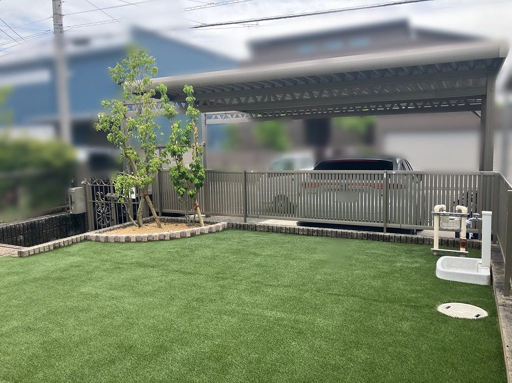 お庭全体には人工芝を敷設し、見た目の美しさとお手入れのしやすさを両立。