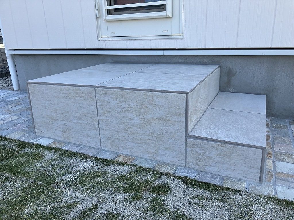 既存のモルタルステップにはタイル張りを行い、足元の石張りとの風合いを合わせました。