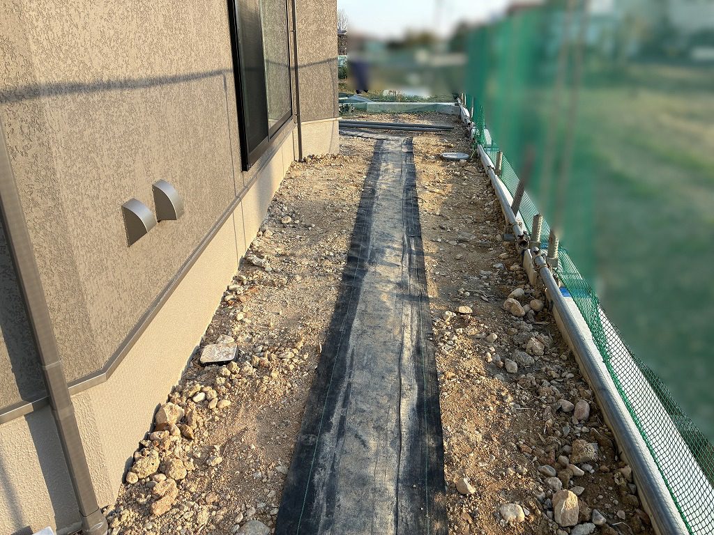 下に防草シート、砂利を入れることにより雑草対策と水はけも同時に行えるようにしました。