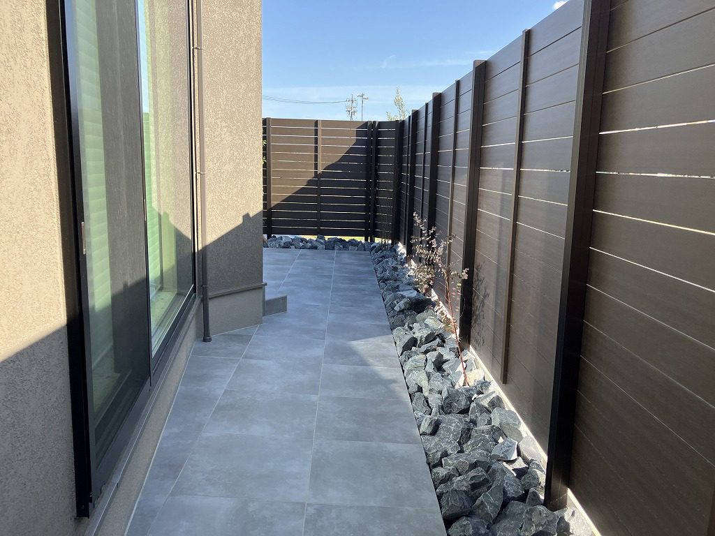フェンスとタイルデッキの間にダークグレーの大型割栗石を敷き詰めることで、空間に立体感とモダンな高級感を与えています。